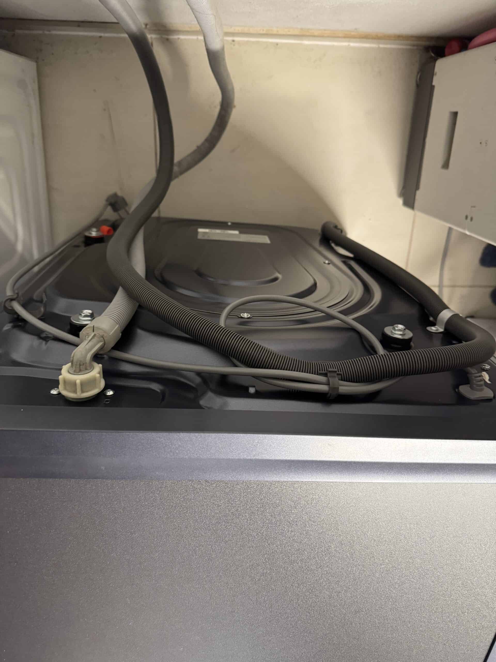 Nach dem Auspacken muss lediglich der Kaltwasseranschluss sowie der Schlauch für das Abwasser angeschlossen werden. Zudem müssen die vier Transportsicherungen auf der Rückseite ausgeschraubt werden.